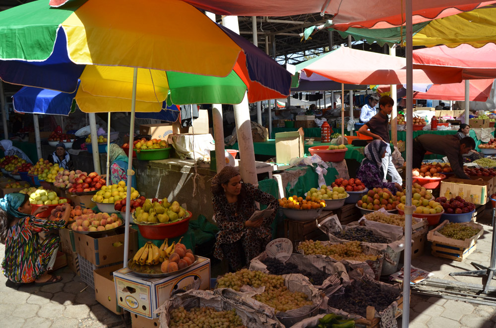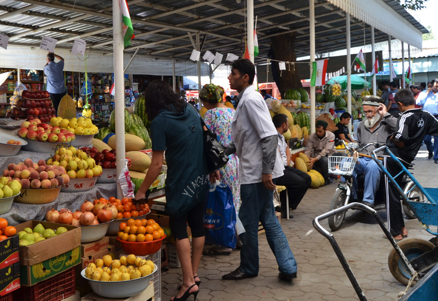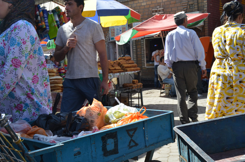 Shoppers load these carts up, and there are boys who then push them from the market to the vehicles for a tip |