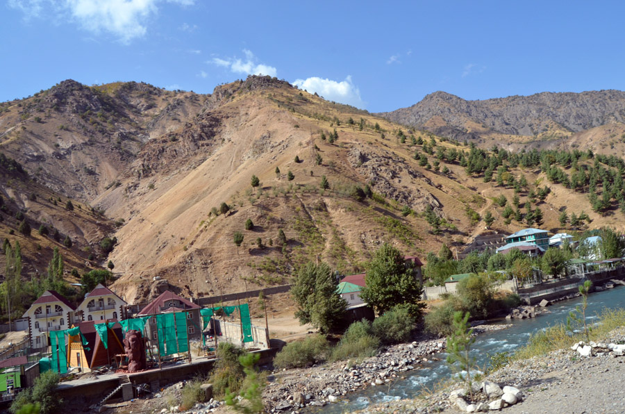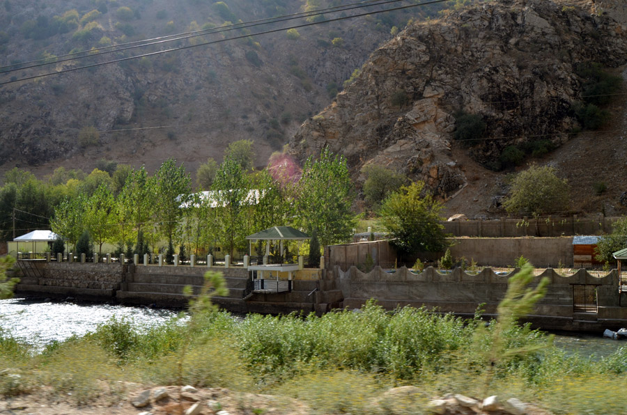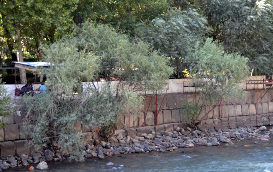 | All along the river one can see these small platforms. Some are used for commercial purposed in the summer, when this area is a major vacation site for locals, escaping the city heat, others are used just for their families and friends. They can even sleep on them lulled by the sound of the rushing river. Here I just happen to catch a late. off-season, group that is using a platform. For the winter-sport afficionadoes there is a ski resort not too far from here. |