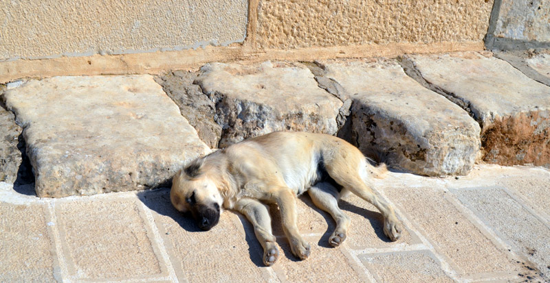 | The bridge-building Roman legion forgot their dog. As I walked by, the tail started to wag. She was so perfectly colored, I did not even see her lying there. Note the original stones that paved the bridge nearly 2000 years ago, along the edge. I am glad they left them when they put the new pavers down. |