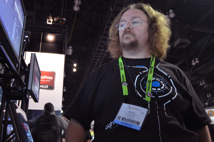 | Deuce Bennet, mathematician, programmer, and former movie special effects guy (blowing things up - for real), captured while preparing the system to give me a motivational crash-course on LW 11.5. Most impressive (both). |