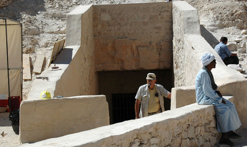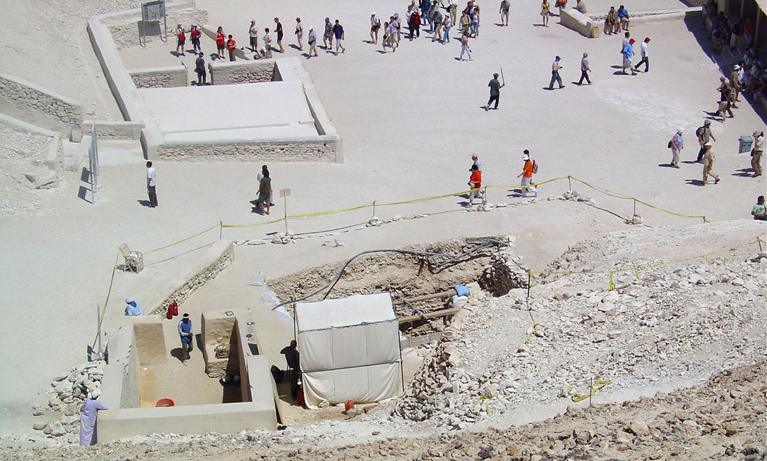 The spur of the valley leading toward the tomb of Amenophis II, the top path, with a person in the entrance of the tomb of Horemheb. The first path to the left leads to the tomb of Tutmosis III, located at the very end of the canyon. All this is just part of the very large tomb complex, with more finds to be expected. |