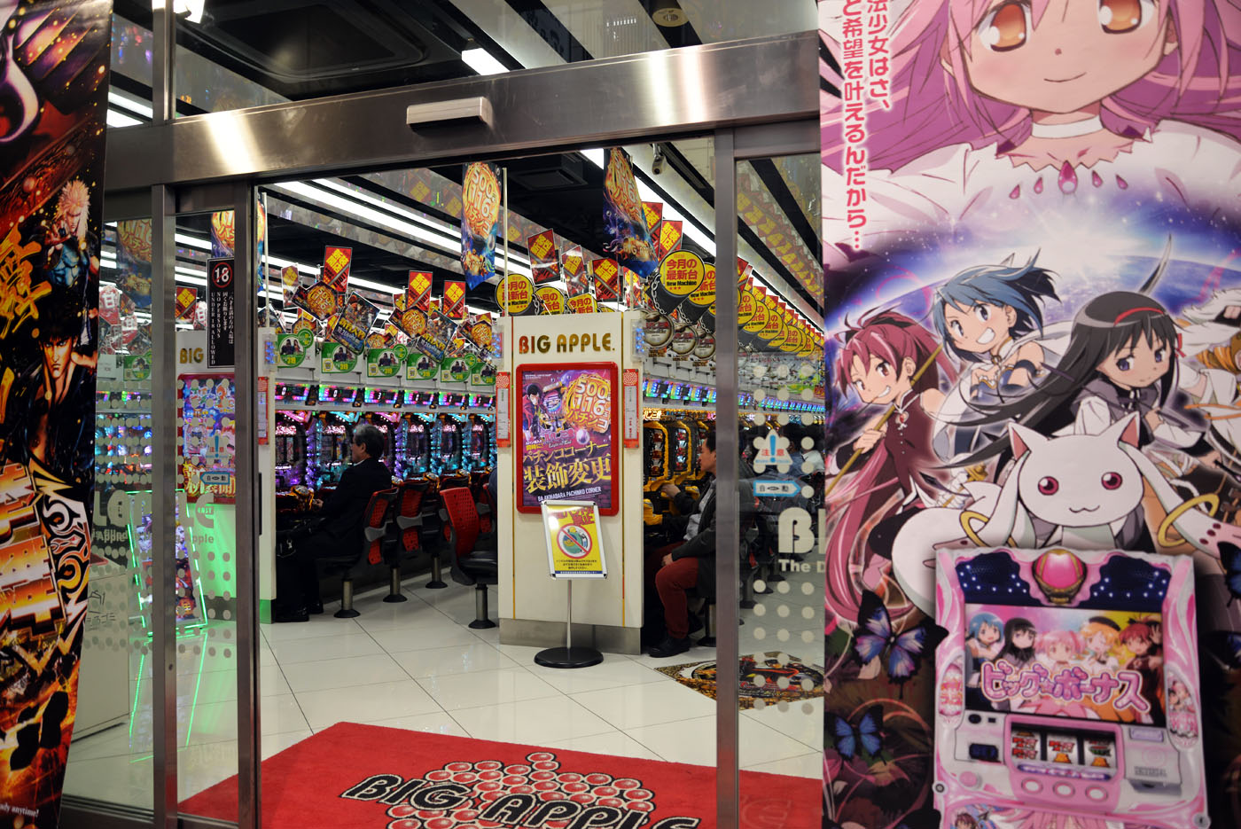 All the 'action' inside of a typical pachinko parlor. Little chrome balls that bounce off pins (pinball) and when a certain number is generated, may get a prize. Also, advertised: one-armed bandits |