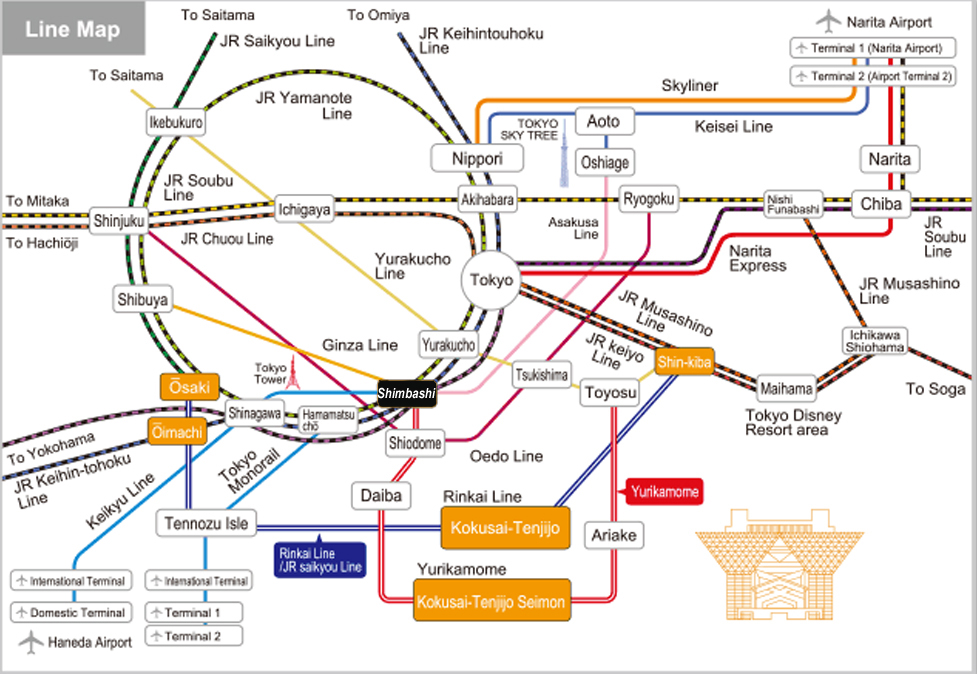 | Getting there is easy. From any part of Tokyo use JR rail (cheaper than the subway) to get to Shimbashi Station. You exit the station, attendants will direct you, and walk to the stairs leading to the Yurikamome Line. There, smartly, buy a two-way ticket and you will get two tickets in the tray. Get off at Stop 11 and there you are, Tokyo Big Sight. The Tokyo convention and exhibition center. For example, I come via the Chuou Lline (far Left) and Shinjuku, Mitaka, Tachikawa, and then with the Ome Line from Fussa, where Yokota AB is located. |