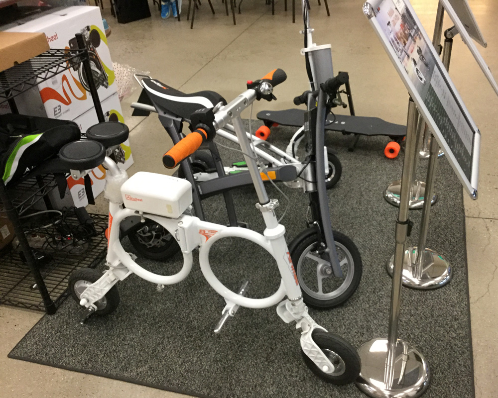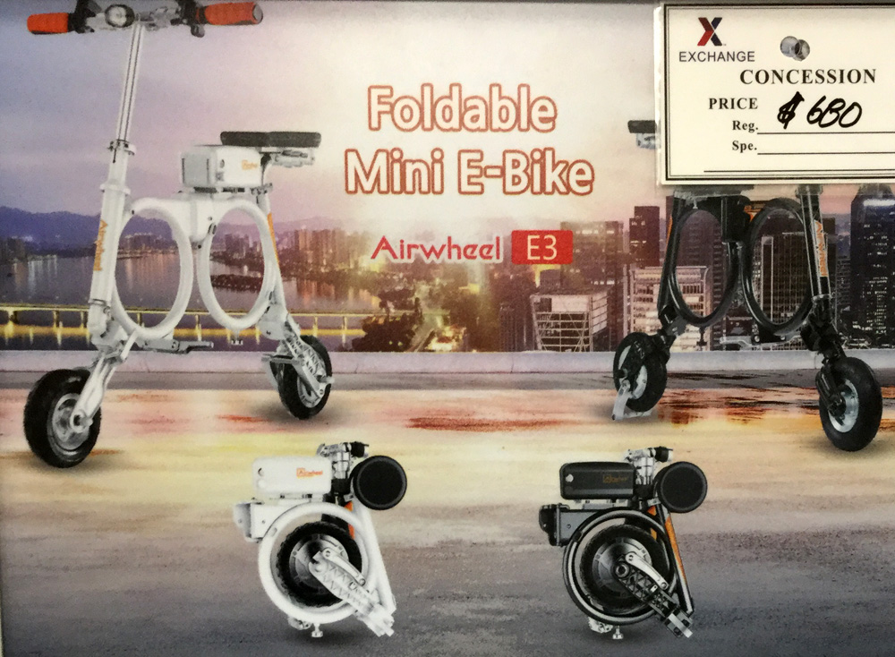 On most overseas bases, there are US cars and Harley Davidson motorcycles available (usually for stateside delivery). However, this was one of the more unique items I saw for sale inside the building. It folds up into a tiny package that one can throw in the trunk of any car. Yup, I see it as well. There's an electric scateboard for sale, too. |