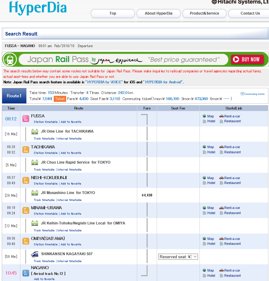 | This turned out to be the most important schedule. I had it on my tablet and carried it everywhere. These are all of the stations and train changes I had to do to get to Nagano. The times were not as important for me as getting to the right station. The frequency of trains is sufficient that you'll never have to wait excessively long. There are other ways, but once I traveled this one, I had the stops and train lines memorized and reversed the whole thing to get back to Fussa. The place to find this one and other maps like it for other destinations, e.g. Nikko or Kioto, to name two, is on Hyperdia.com. You can pick your date and time and it will come back with a schedule tree like this and various options regarding travel time and cost. An excellent train travel aid in Japan. |