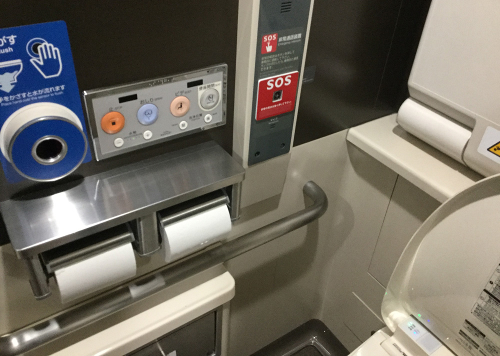 The immaculately clean bidet-style toilet on the Shinkansen. Natually, the seat is heated but it also has a number of other functions some of you might enjoy to explore.