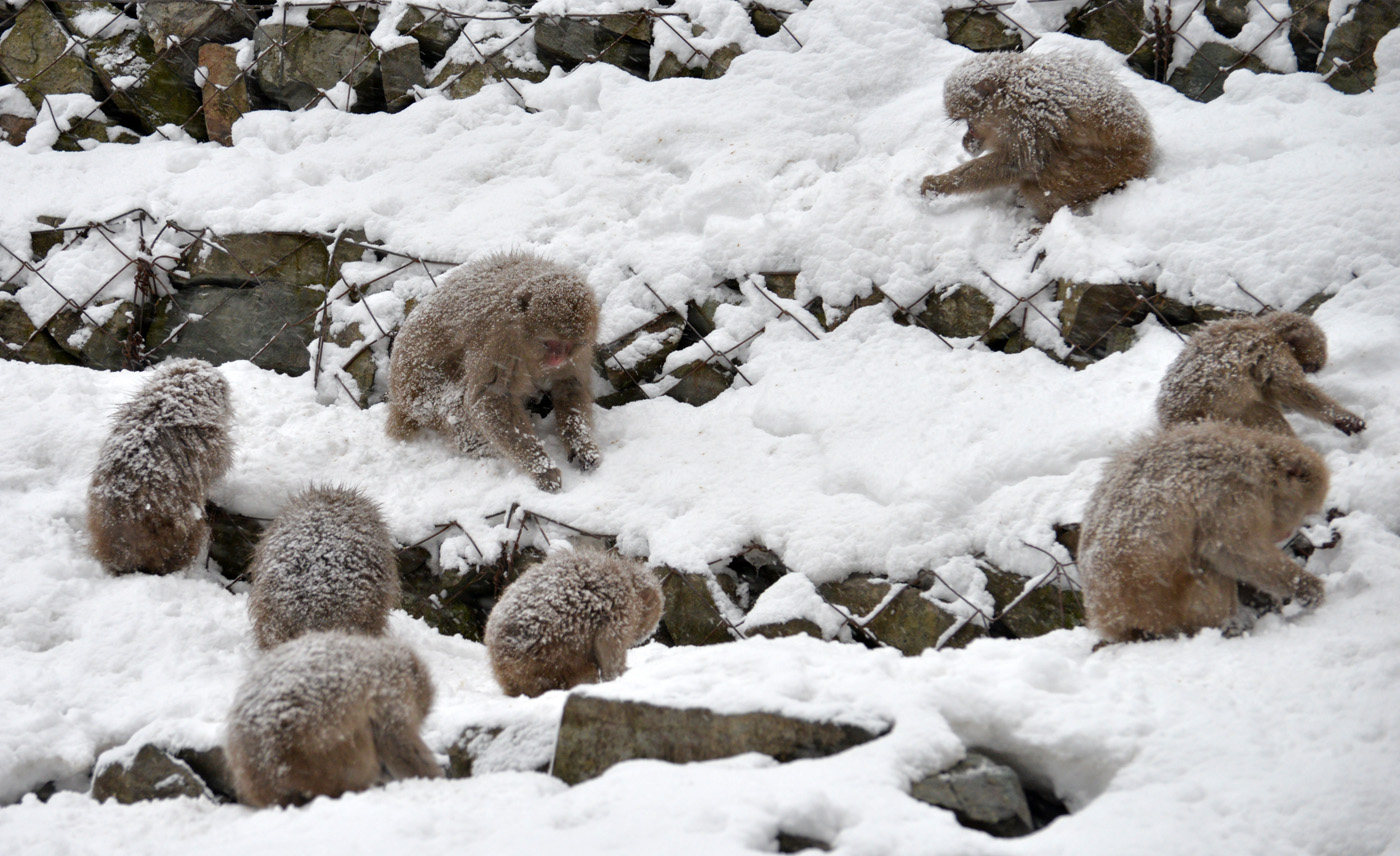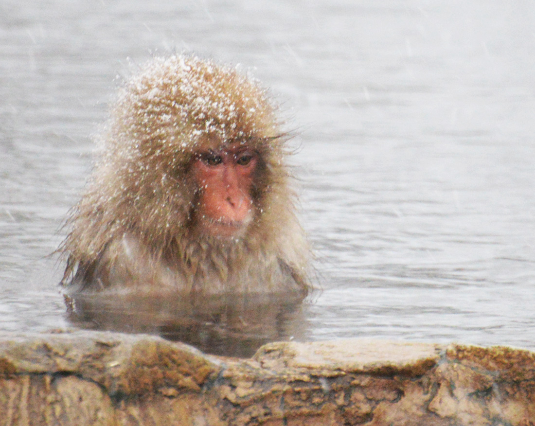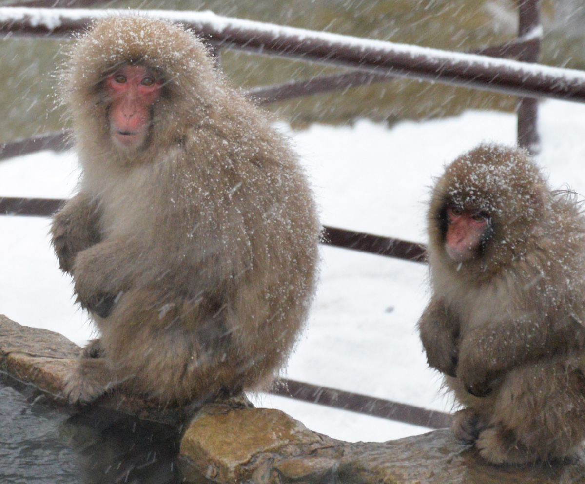 So, I got to Nagano station. On the platform is a great noodle stand and I was hungry. It had to be good because of sizable number of Japanese ate there. Unfortunately, by then my mind was processing ahead to the next steps I needed to take and I did not take any pictures. After the excellent noodle soup, I exited the platform and asked an attendant, still in the Shinkansen section, how to get to Snow Monkey Park. He pointed at a large hand-written sign that indicated two busses that would take me there. I followed another sign, once I checked through the gate, and found the bus stops down below, next to the station. I waited and a couple of young American guys came up with booklets in their hands. I asked them if those were tickets and they said that they were a combined bus round-trip and park access ticket. They told me where to get it. That was the riduculous part. A bus just arrived and I followed their directions. I had to go down a long flight of stairs, follow a long tunnel all the way under the Nagano train station, and nearly at the other side, there was a series of windows, once of which advertised the park and bus tickets. By then it was after 1400 (2 PM). By the time I finally got back, the bus and the two Americans were gone. The weather was hazy, snow was in the air, and the next bus was not due for nearly an hour. I was furious. I stood there in the cold wind and watched buses pick up people on winter vacation tours from all over the world. The greater Nagano area is a prime ski and winter sports area. Japan, after the US, is the second most ski-crazy nation in the world. Meanwhile, as the sky darkened, so did my mood. I was thoroughly pissed off. Finally, at long last the bus arrived. I got on and at least was out of the icy wind. The bus, at guaranteed safe speeds, slowly made its way out of town, passed the old Winter Olympics stadium, and into the open country and toward the mountains. When I finally got to the Park bus stop, an large group of Western, mostly American, tourists were waiting to get on. An old Japanese woman was running the bus stop and kept yelling four and held four fingers in the air. I looked at the tourists and asked, what does she want? They said, the park will close at four. It was 1510 (3:10 PM). Dang! This did not look good. I was very upset by this time. This whole excursion cost me about $150.