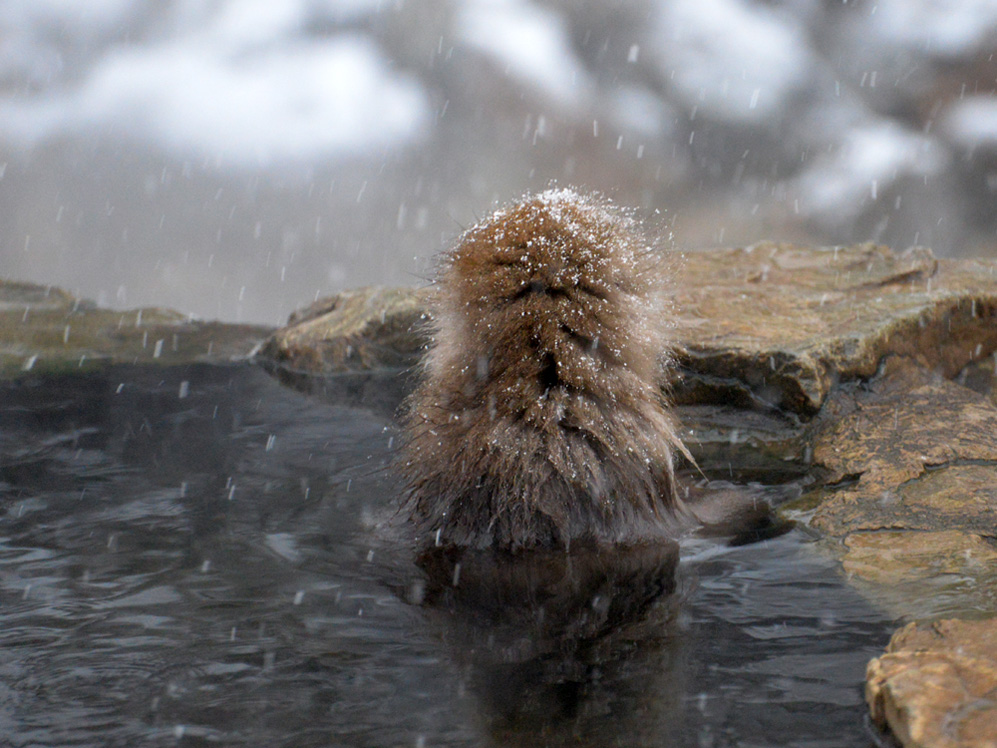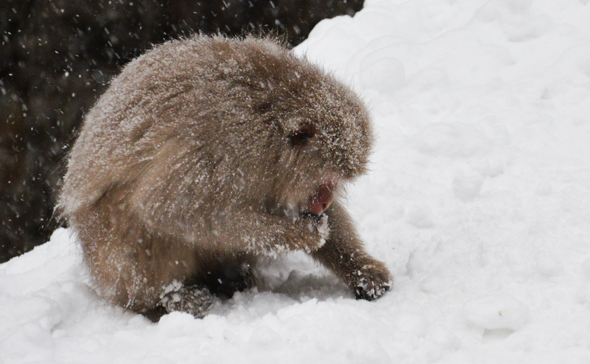 Behind the building there was a small bridge, some rails to keep people from where the monkeys were, a little hot pool, and some idiot who was positively irate that I was still coming in. He kept yelling that he was closed, at me. I told him that I came from Tokyo and had to leave today again. He then said, ok, ONE MINUTE! I looked around, and there were a number of monkeys digging in the snow. A few were by the pool. I had a lot of expletives at the tip of my tongue, but thought, if this is all there is, I had better get busy. I got my camera and two lenses out and snapped a few shots. It was bizarre. I had absolutely no time to set anything up or get into any position for any decent pictures. He finally yelled, about three minutes later, after I was switiching lenses, CLOSED, CLOSED! So, I thought, this is it. I spent a long day, dealing with the rides, the stupid location of the ticket booth almost as far from the bus stop as is possible, a crazy race up the mountain, and now got about ten pictures. I was so hot under the collar, I was melting snow around me. I angrily stomped out. Here's what I got (not too shabby, considering the insane circumstances and a guy yelling at me and hovering over me, snow falling, and me changing lenses in the middle of it all. No pressure....:-) .
