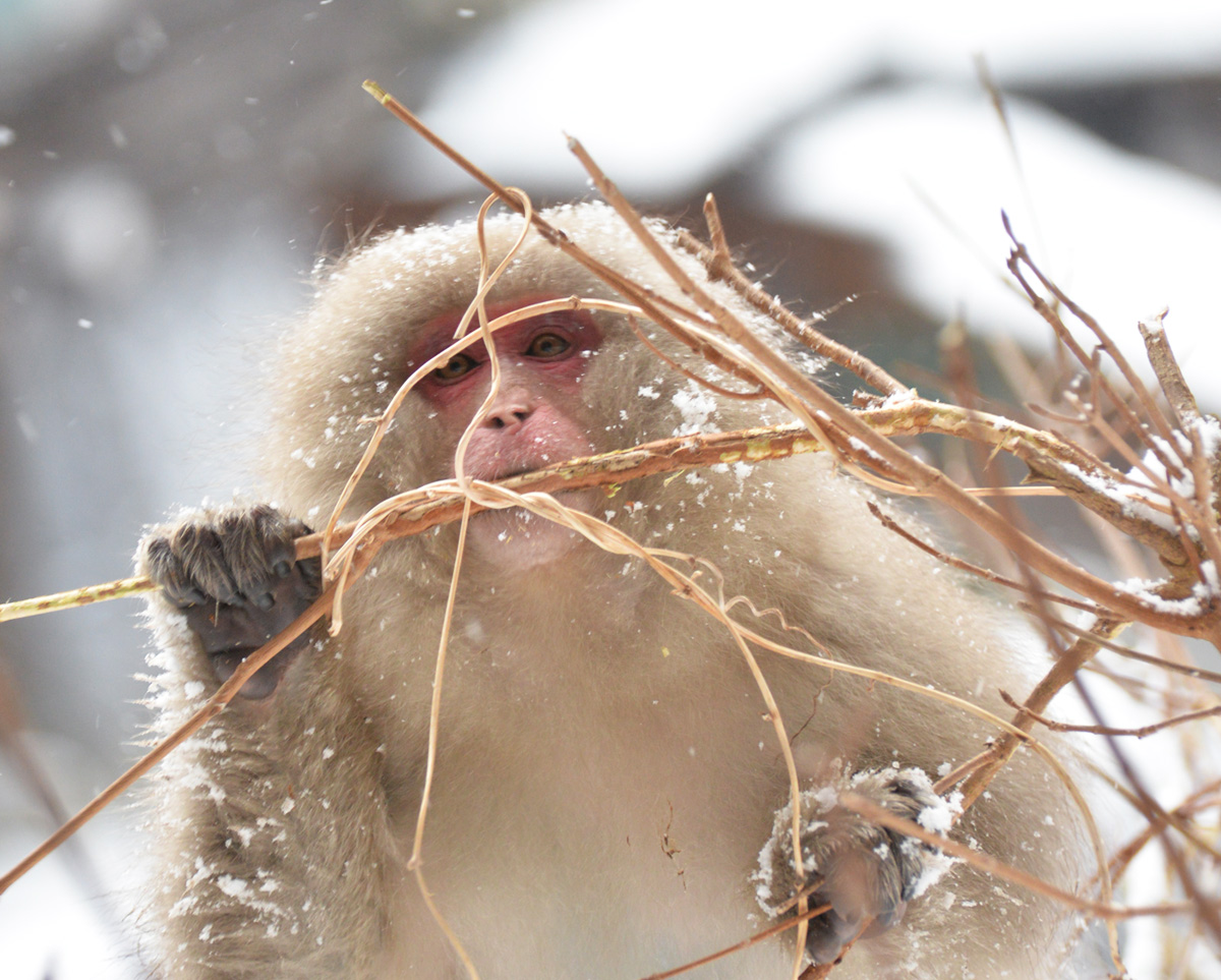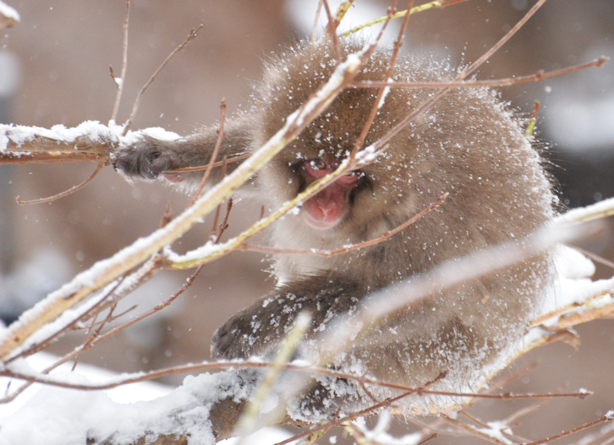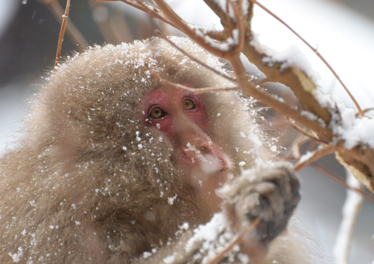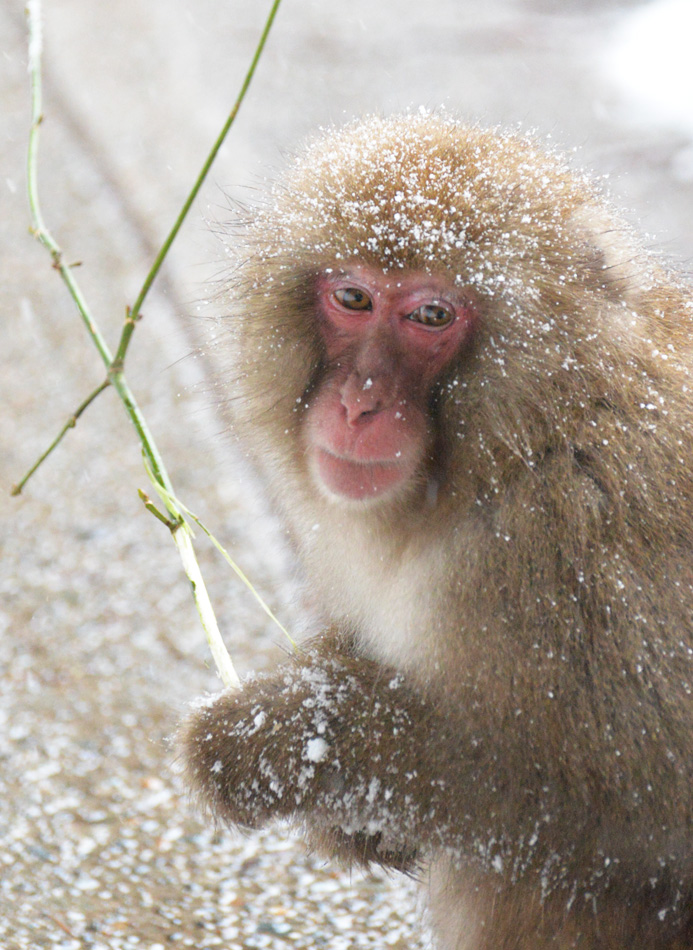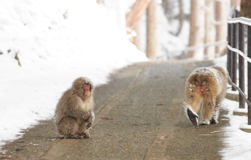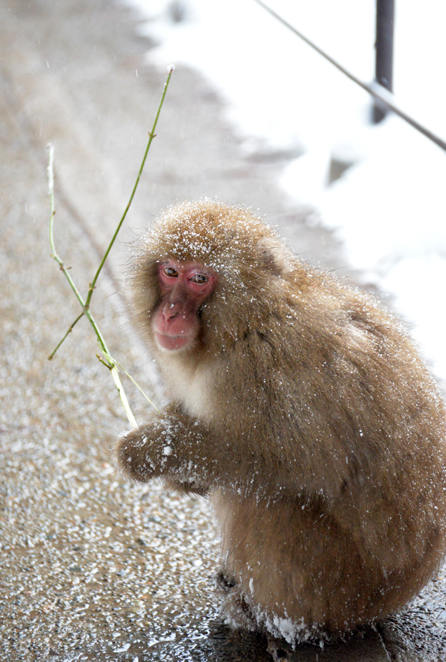 Back in the hut, the employees were cleaning up and getting ready to go home. I saw their toilet and said things under my breath and used it. The seat was heated, I remember, and the facility, Japanese-spotless. I was bummed. I then walked out the exit, and the older guy, in charge of the place, came after me with my wool watch-cap. So, very dejectedly, very angry and disappointed, I stood below the steps of the building and cleaned my gear and tried to get a grip on my emotions. There was a rail to keep you from falling off the mountainside, and then I realized that the monkeys are free to roam the hills. They are not confined, the visitors are. Meanwhile, the employees were coming out of the building, all five of them, and walking, laughing and chatting, down the hill to their mopeds and left. I stood, attached the telephoto lens, and hoped that I would be able to see some of the monkeys on the far side of the creek. I actually did, but they were really far away. It got really quiet. No more people at all, just me in the fading light outside of the hut. And suddenly, there was the sound of little feet. First one, then another, and then more monkeys were walking right by me and heading down the path. My heart skipped a beat, are you kidding me? I got the mountain, and no oither humans around, just me and my monkeys (wasn't there a Beatle song?). I stood absolutely still. The monkeys could not have cared less and just started to look for bark to chew off twigs. I hoped that I would not spook them and very slowly followed them downhill.