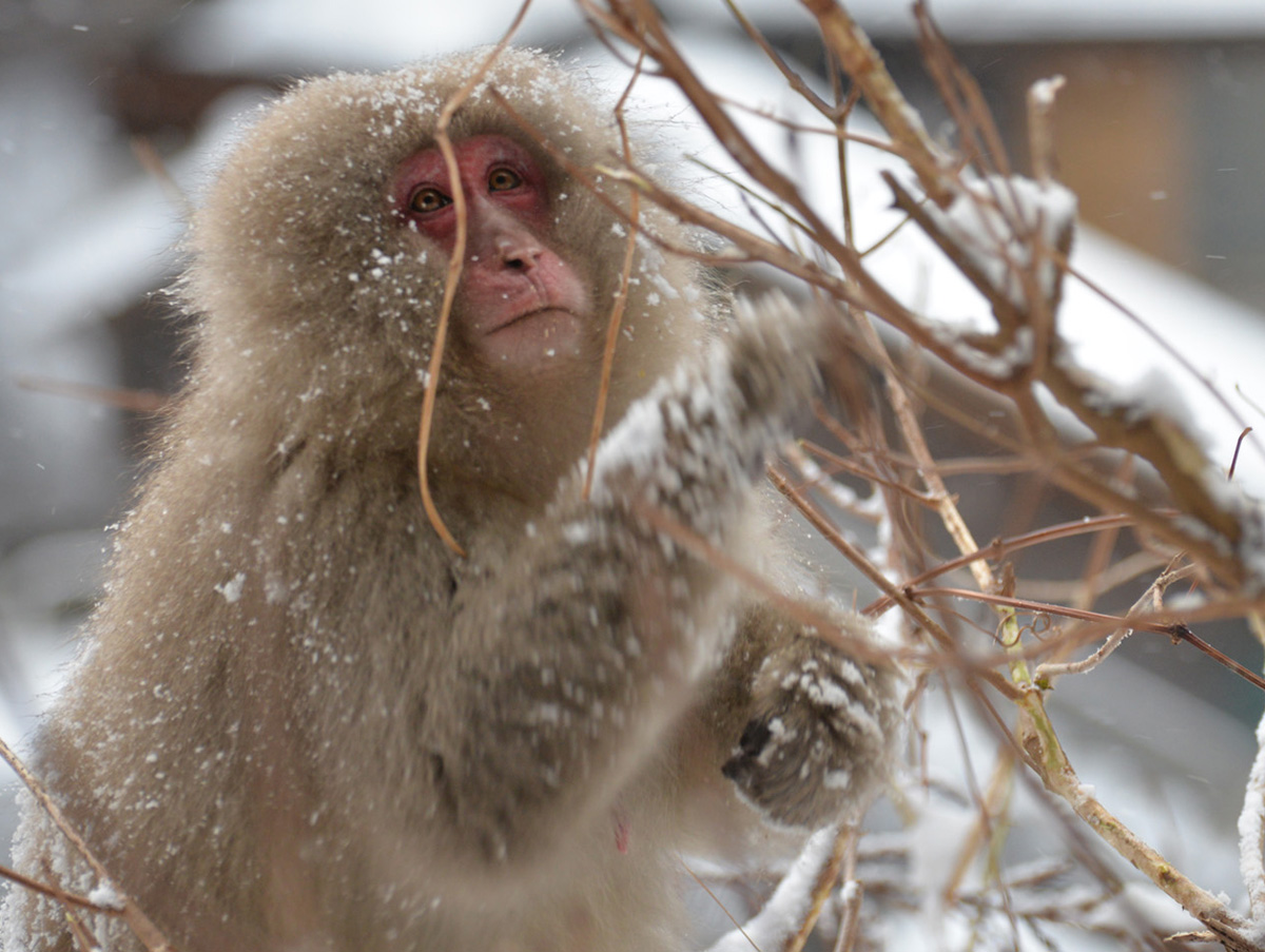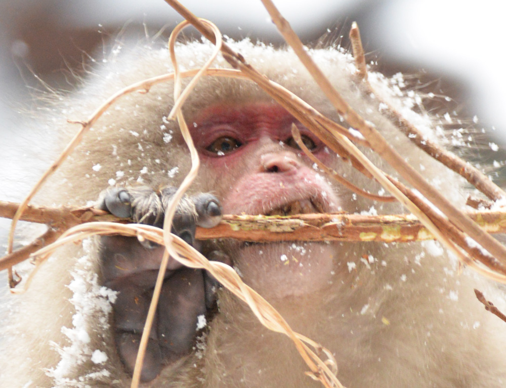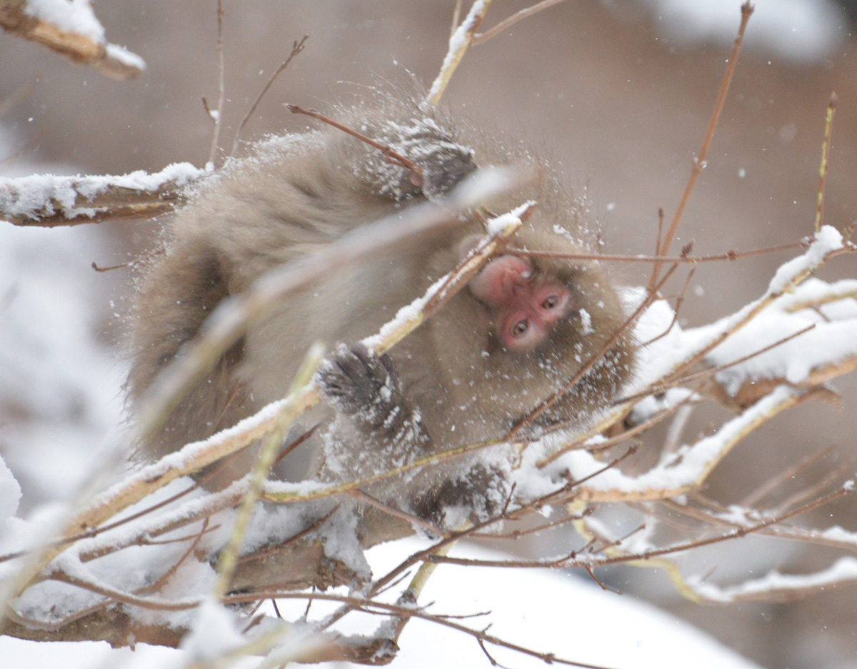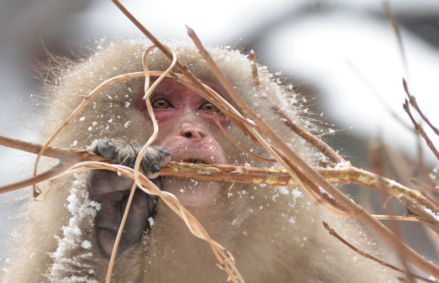 Back in the hut, the employees were cleaning up and getting ready to go home. I saw their toilet and said things under my breath and used it. The seat was heated, I remember, and the facility, Japanese-spotless. I was bummed. I then walked out the exit, and the older guy, in charge of the place, came after me with my wool watch-cap. So, very dejectedly, very angry and disappointed, I stood below the steps of the building and cleaned my gear and tried to get a grip on my emotions. There was a rail to keep you from falling off the mountainside, and then I realized that the monkeys are free to roam the hills. They are not confined, the visitors are. Meanwhile, the employees were coming out of the building, all five of them, and walking, laughing and chatting, down the hill to their mopeds and left. I stood, attached the telephoto lens, and hoped that I would be able to see some of the monkeys on the far side of the creek. I actually did, but they were really far away. It got really quiet. No more people at all, just me in the fading light outside of the hut. And suddenly, there was the sound of little feet. First one, then another, and then more monkeys were walking right by me and heading down the path. My heart skipped a beat, are you kidding me? I got the mountain, and no oither humans around, just me and my monkeys (wasn't there a Beatle song?). I stood absolutely still. The monkeys could not have cared less and just started to look for bark to chew off twigs. I hoped that I would not spook them and very slowly followed them downhill.