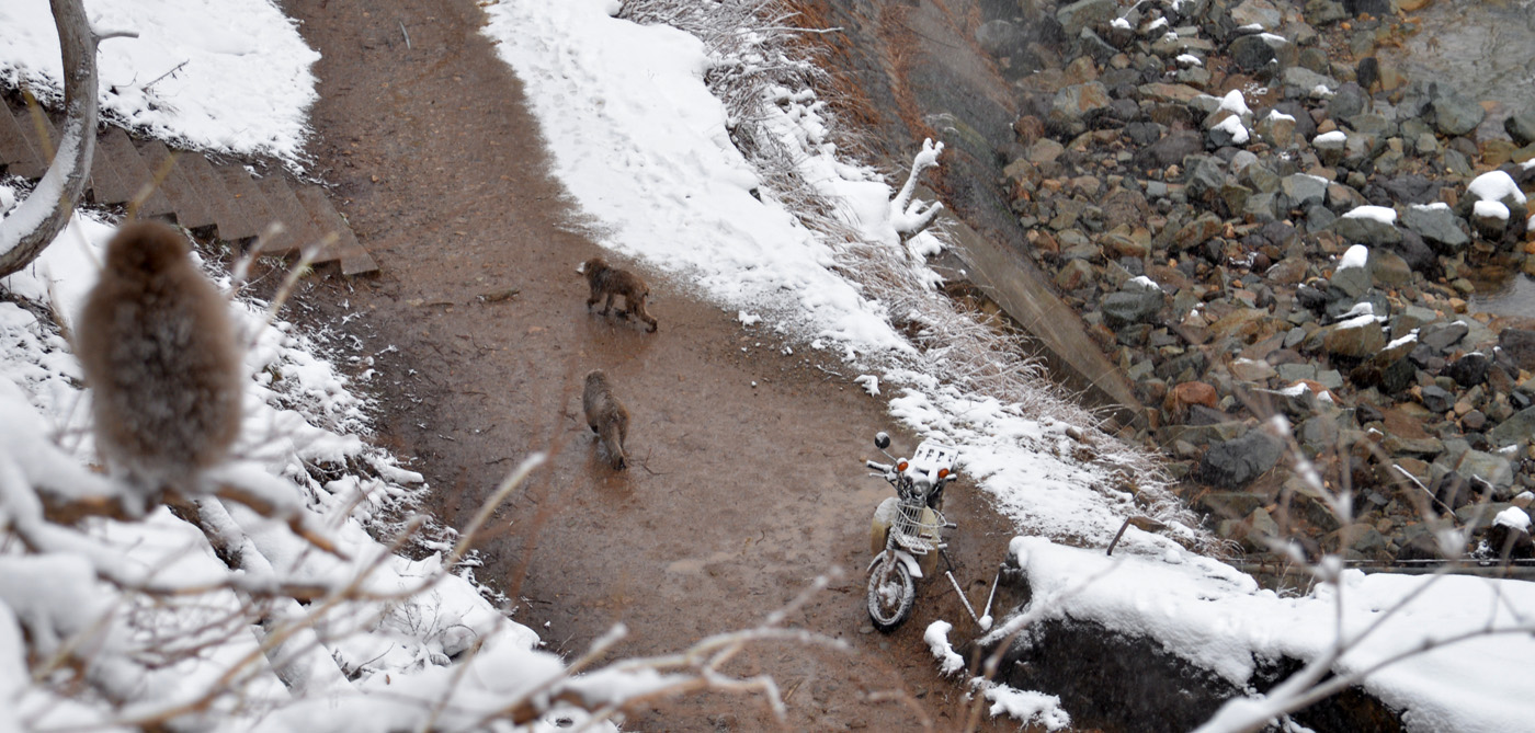 Looking down on my side, I saw monkeys slowly moving from behind the park buiding, down the side of the mountain, next to the creek edge, past the mopeds the employees departed on a little while later, and I knew there would be a chance for some more pictures. I was patient and hopeful and realized that a unique show was about to begin.