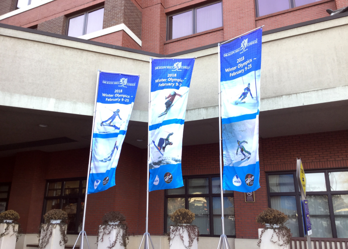 Being still late January and very early in February, I waited a few days. It was quite cold in South Korea and the days rarely reached freezing. When I finally got on a bus to Seoul, the sun was shining and I figured I would at least have good weather for taking pictures. I went to the Dragon Hill Hotel on Yong San Army Base in Seoul, and these flags was the only thing I saw that reminded one of the upcoming Olympics. After talking to the lady at the information and tours desk, I found out that the new high speed rail line was operational, but that the train station was miles outside of PyeongChang. Also, she said, there would be free shuttle buses around PyeongChang and to the various ventures, many of which were in the surrounding mountains. However, she informed me (in perfect English), none of those buses are running at this time. They will start on February 8th, about a week away. It would be all taxis for me, from the hotel to the Seoul train station, and from Pyeongchung train station into town, and all around. The (temporary) stadium, where the opening and closing ceremonies are to take place, was not quite finished at that time, and none of the athletes had arrived yet. It didn't sound very promising to me and definitely not cheap. So, with heavy heart, I decided that I was way too early and that it simply would not have been worth my time and money, and called it off. Headed back to Osan AB, and hung around there, waiting for a flight back to Yokota AB, Japan. |