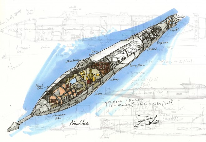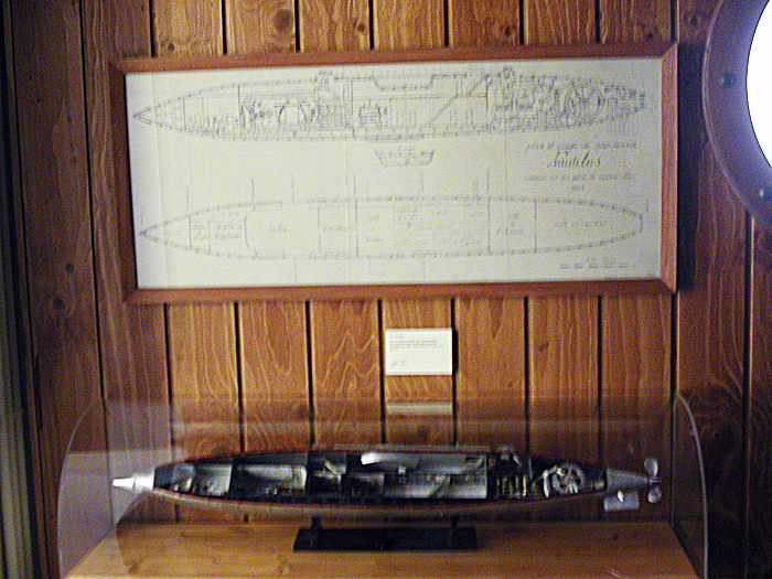 There, among some other displays, was a model and Verne's drawings of the Nautilus submarine |