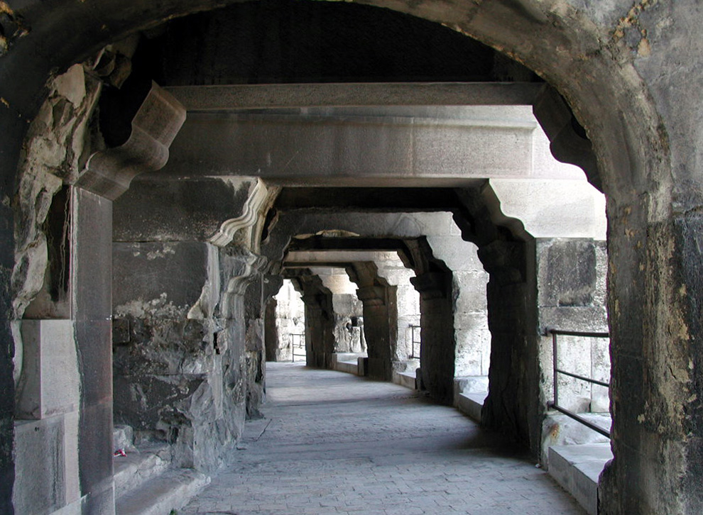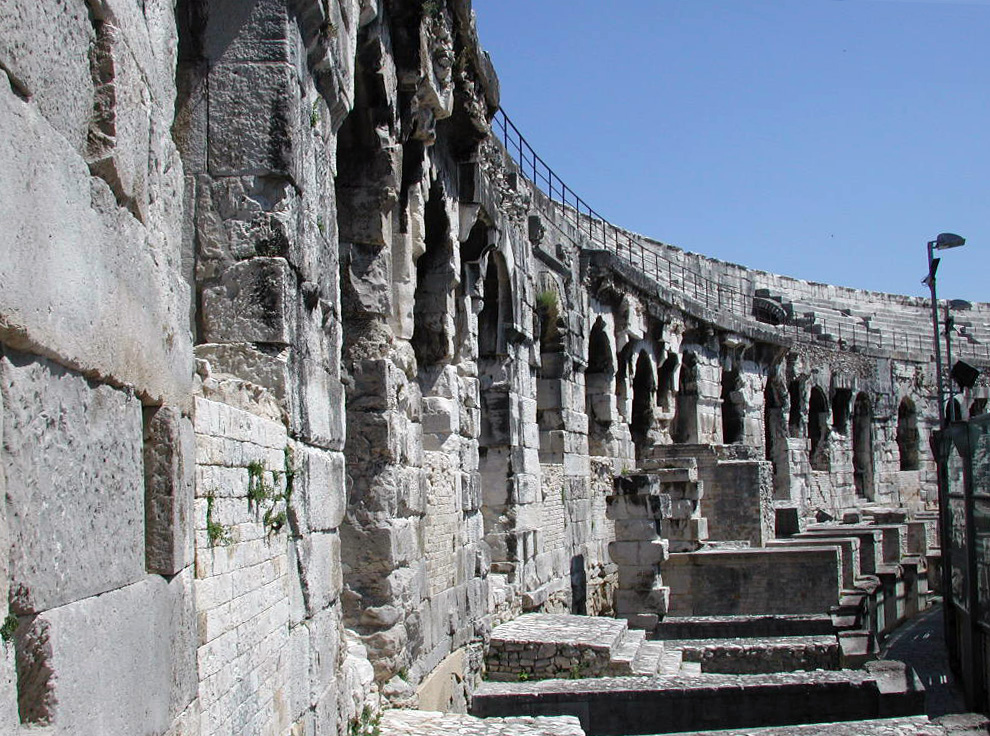 Note the toothlike extrusions around the edge. They once held wooden masts to which large canopies were connected to provide shade for the audience. France, perhaps lacking our paranoia about safety, permits visitors to wander all over this structure, right to the stomach churning edge. |