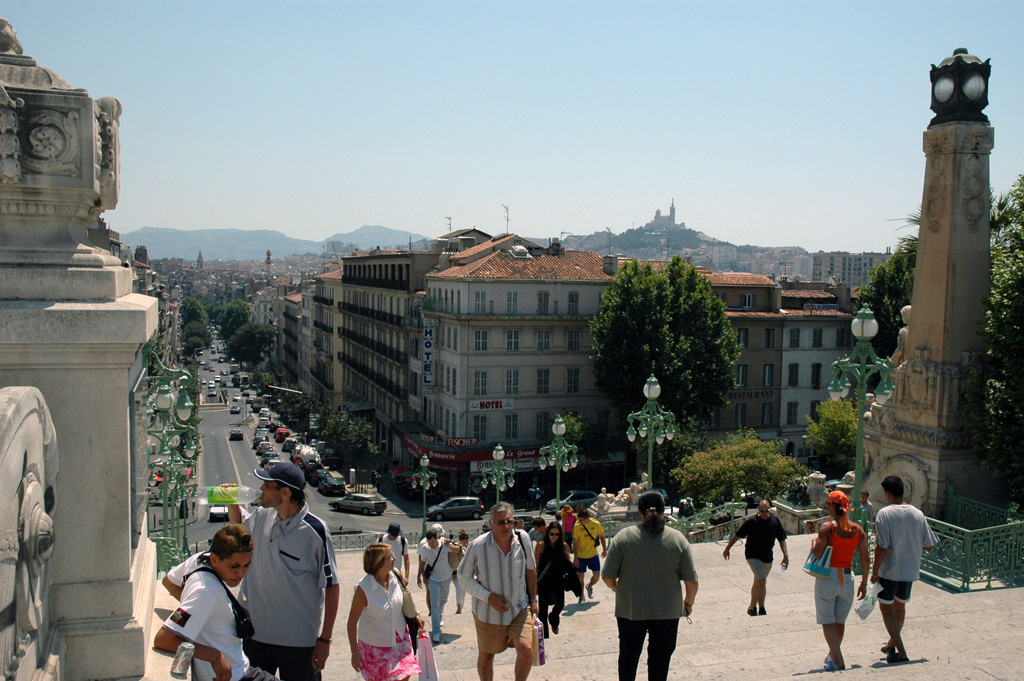 View of Marseille on a sunny day in 2005, from the train station, and saw the hotel where I stayed in 2001 at the corner. |
