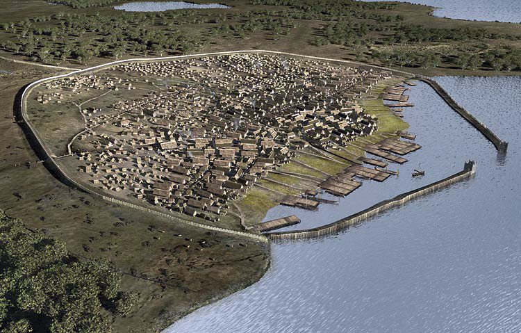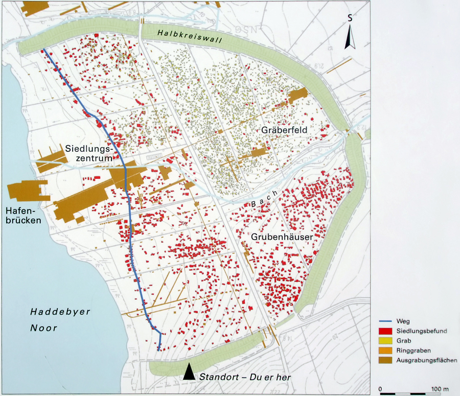 And with the museum complex being about where the center of the settlement was. The shield wall is clearly visible, even 1200 years later. One of the archaeologists told me there there were still a number of ships in the mud, where once the harbor was, and that they excavated only a few sites, to leave as much as possible to future studies, hopefully performed with advanced instrumentation. |