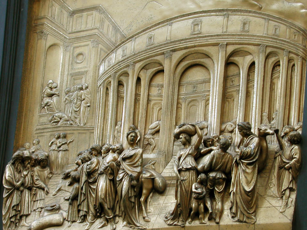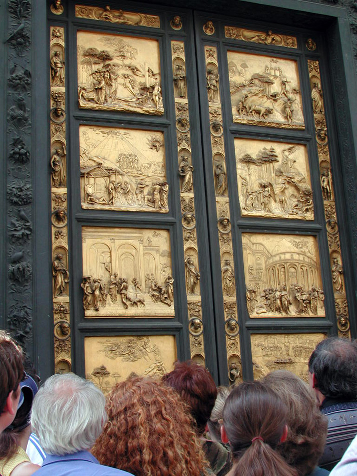 One of the golden door panels close up, each of which depict multiple scenes from the Old Testament. The panels are surrournded by 24 small bronze busts of famous Florentines, including one of the artist himself, Lorenzo Ghiberti |