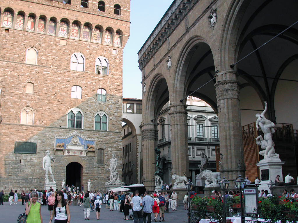 The next and most important place to visit is the Palazzo Veccio, ahead, and at right the Loggia dei Lanzi sculpture display |