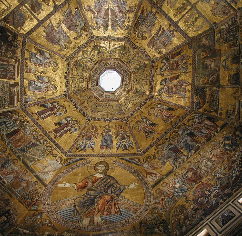 Inside of the small dome, a stunning mosaic. I was jokingly saying that when the last monk placed the last stone, they must have collectively fainted, and then the party would begin. The Baptistery is octagonal and the mosaic extends in each direction equally. |