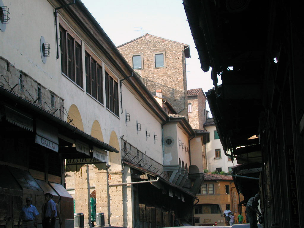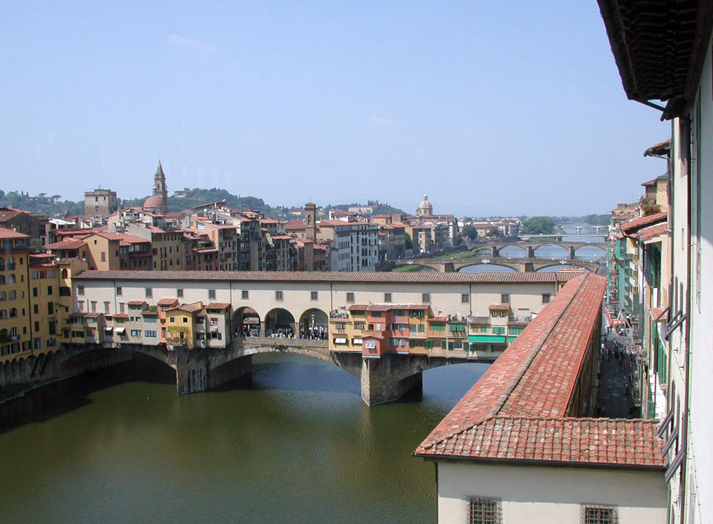 However, from up high something very different is revealed. The Dukal passage way. An elevated walkway that permitted the Dukes of Florence to walk in privacy and safety from palace to Uffizi, to the cathedral, and here, all the way across the river, to a large administration building. No one would know when the Duke would arrive at a given point in the city. Windows allowed views of city life w/o being part of it. |