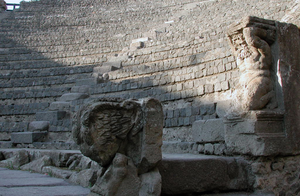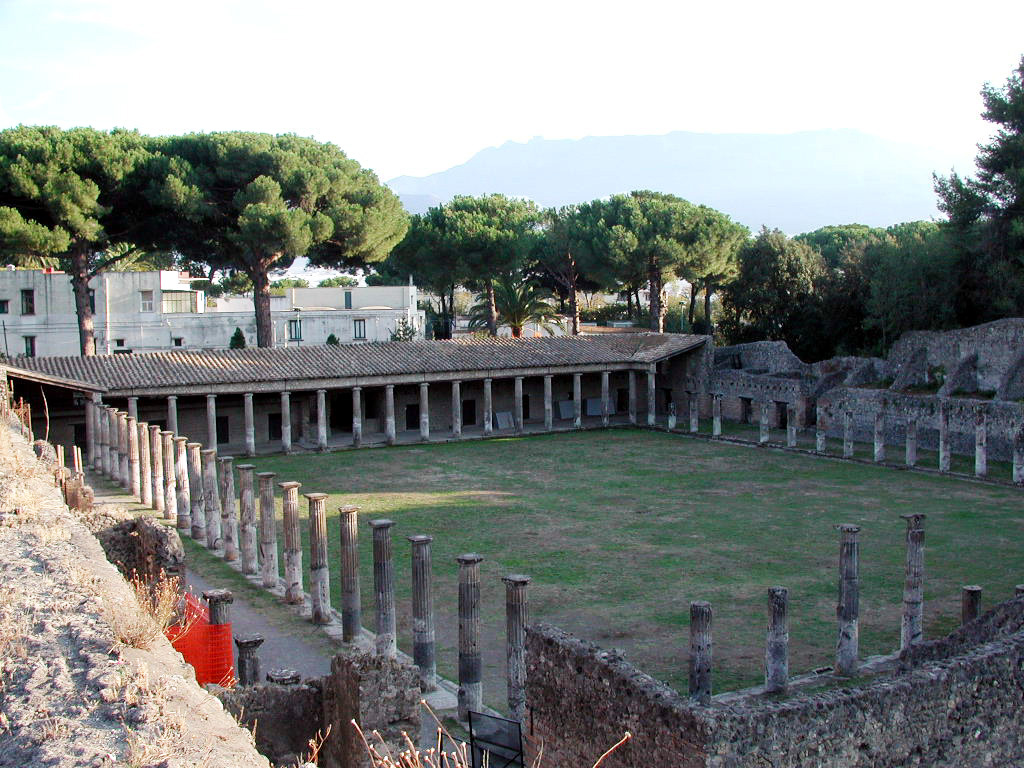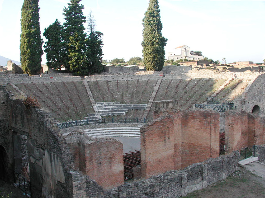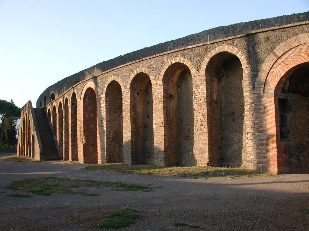 The outside of the ampitheater. Pompeii was founded in the 4th Century and became subject to Roman control 80 BC as Rome expanded south. At the time of its destruction in the 79 AD eruption of Mt Vesuvius, it was a prosperous city of 11000 with a complex water distribution system, the amphitheater, a gymnasium, and a port. Many wealthy Romans had country homes there. |