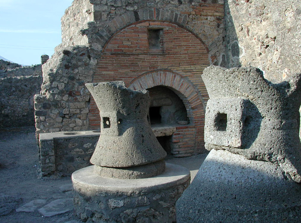 A bakery. There is the oven, and in the foregound the typical Roman grinders. Grains get poured into the top, while the square holes are used for long poles to be inserted, used to turn the upper half of the grindstone on the conical lower grindstone. In the process the grains were turned into flour, that would run out all around the grinding mechanism and swept off the flat shelf into baskets or other conatainers and taken to the baker to be used for the dough to make his products, i.e. stone-ground bread. Watch out for the little rock particles. |