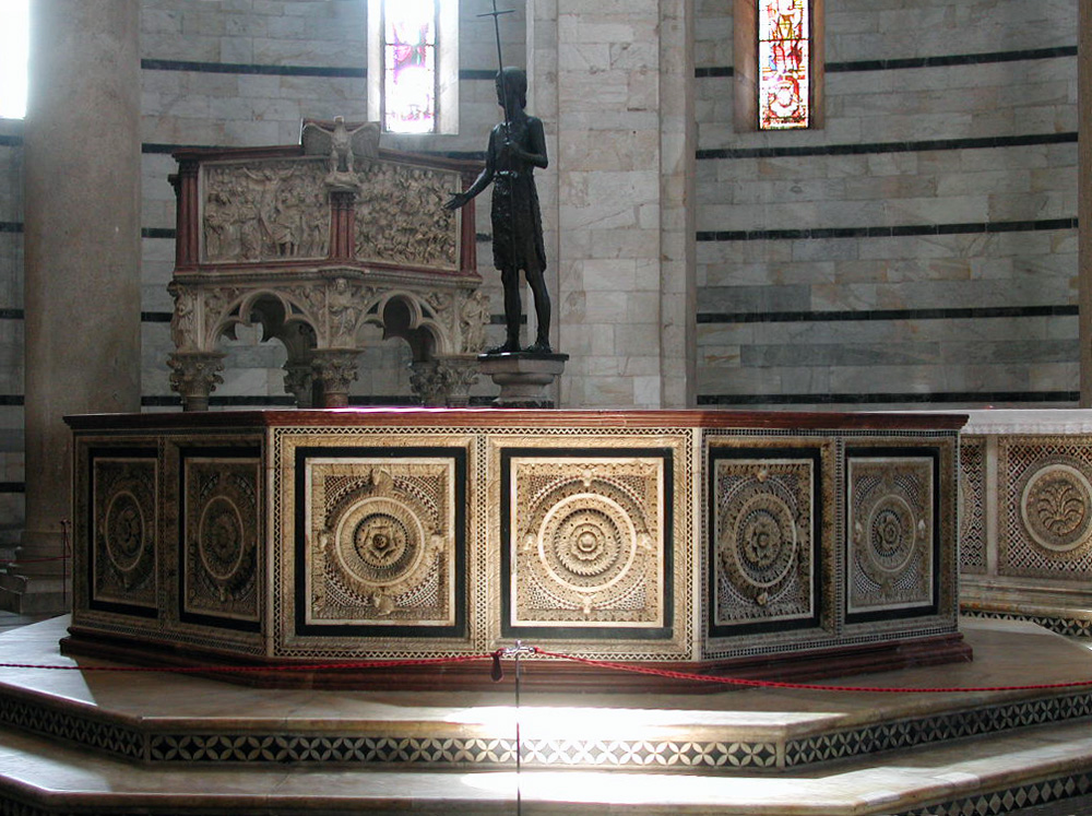 In foregound the baptismal font, with a statue of St. John, behind that the gorgeously carved pulpit by Nicola Pisano |