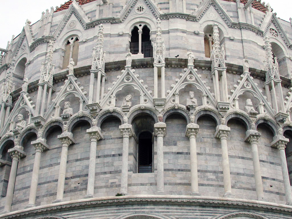 A closeup of the Gothic upper section of the Baptistry, the bottom is done in the Romanesque style |