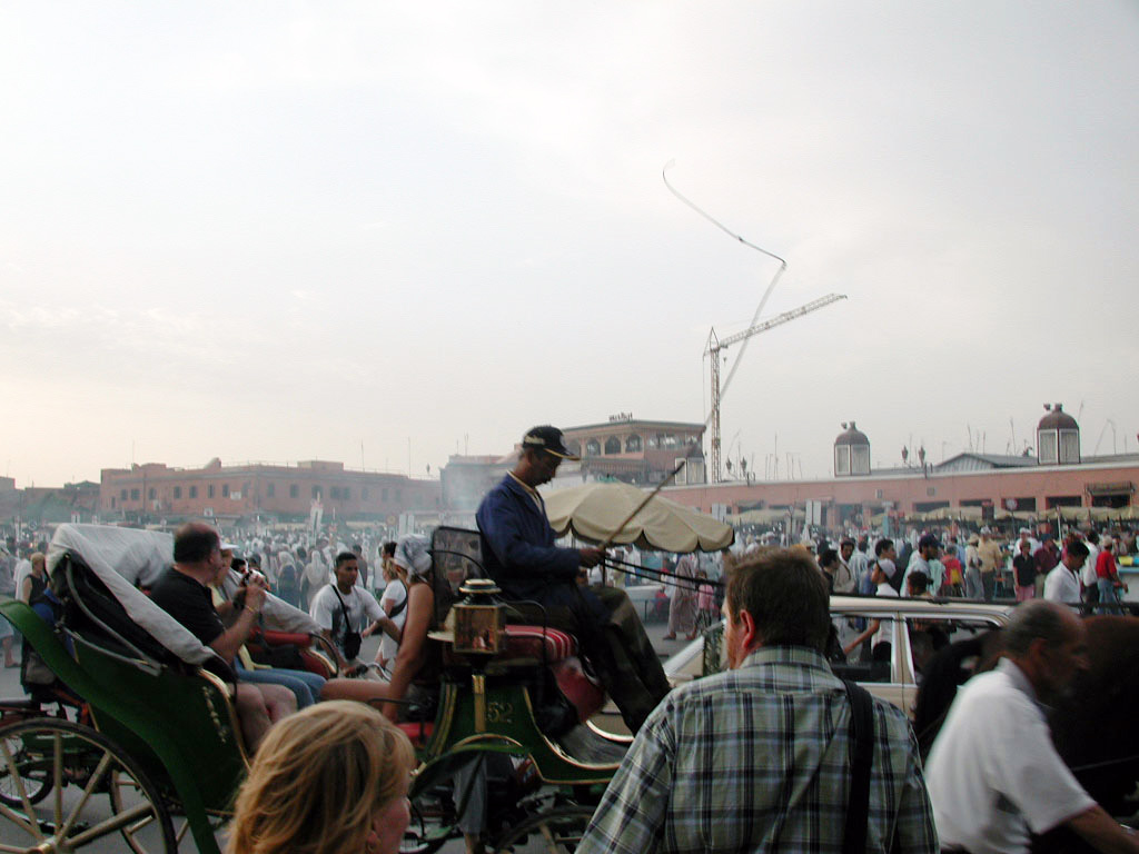 Some tour the square like this. In the background the smoke is from many charcoal fires and food is for sale all over |