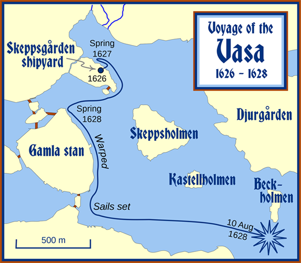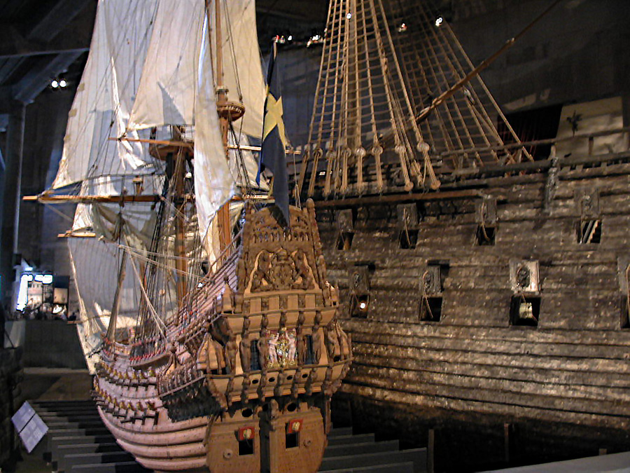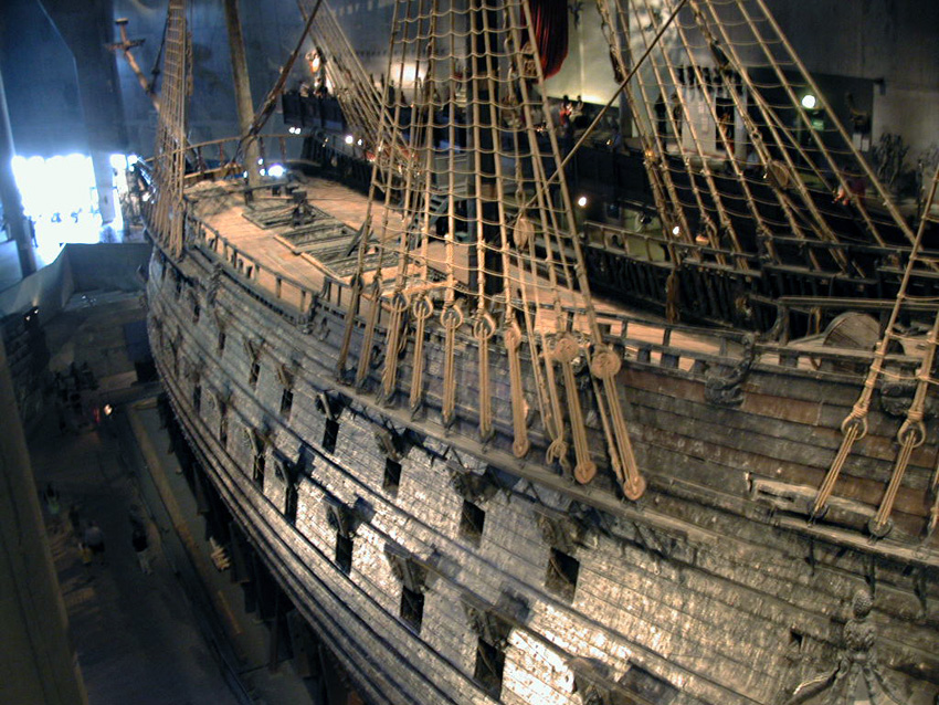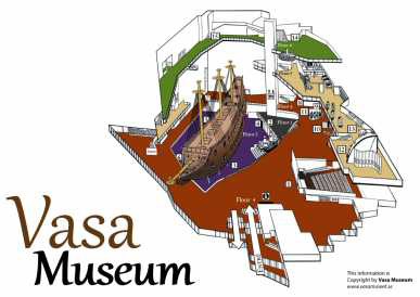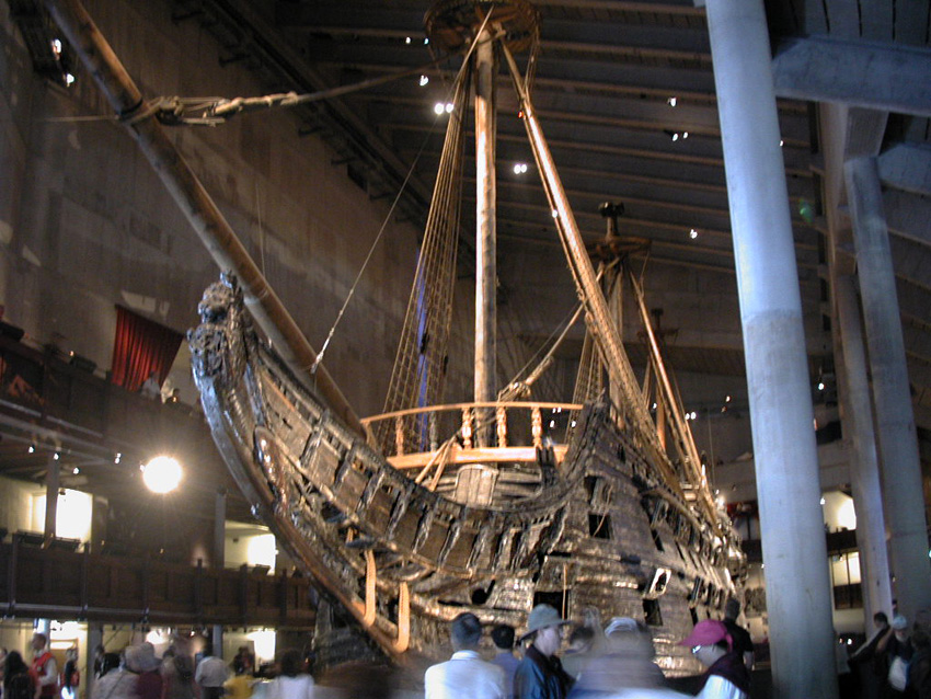 A brief history of the pride of the Swedish navy, the Vasa. The beautiful and powerful vessel of war, equipped with 64 guns and carrying 300 soldiers in addition to the crew would be a huge state of the art asset for Sweden. Comissioned by King Gustav II Adolf (1594-1632), after nearly two years of construction and outfitting the ship, she was ready to set sail on Sunday, 10 Aug 1628. Over 100 crew and women and chidlren were aboard for the first part of the maiden voyage. The ship was warped (pulled with cables) until clear of the shoreline, and then set sails (see map above). Once it caught the breeze, the ship began to heel repeatedly until water entered the gun ports and that spelled the end of the voyage and of a gorgeous and costly warship. She sailed and struggled for 1300 meters and sank. Since the ship was close to the shore and surrounded, as is customary, by many small vessels, of the about 150 people on board 120 were resecued. At least 30 were lost. When the ship was raised in 1961, the remains of at least 16 people were discovered. The reason for the disaster were several, although, it was boiled down to one major flaw, all the guns on each tier were of the same size, which made the ship top-heavy and inherently unstable. Conversely, had the hull been larger to handle more ballast to offset the weight of the guns, they may have ended up with a larger and slower ship, but it would not have sank. As it is, the Vasa is the only 17th Century sailing vessel in existence Their loss was a gift to the future. |