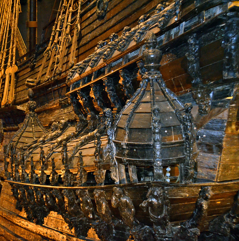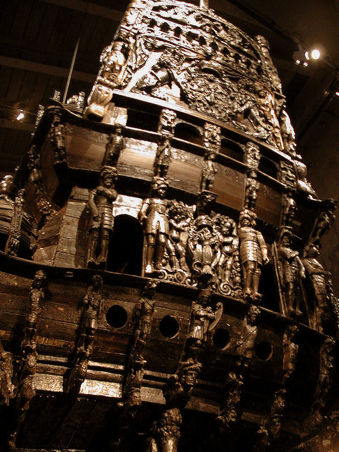The stern imaged 7 years after my visit there. Unchanged, but sharper than mine. At the museum link you can read up on the particulars of these magnificent carving, which were more than just ornamental, but war propaganda for King Gustav. |
