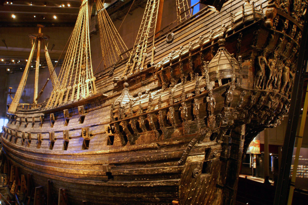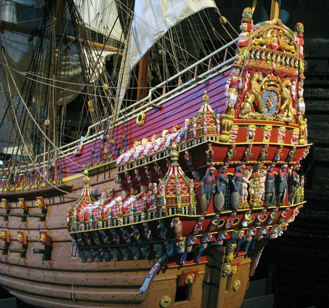 Vasa's stern displaying a vast array of carvings and the kings heraldic symbol |