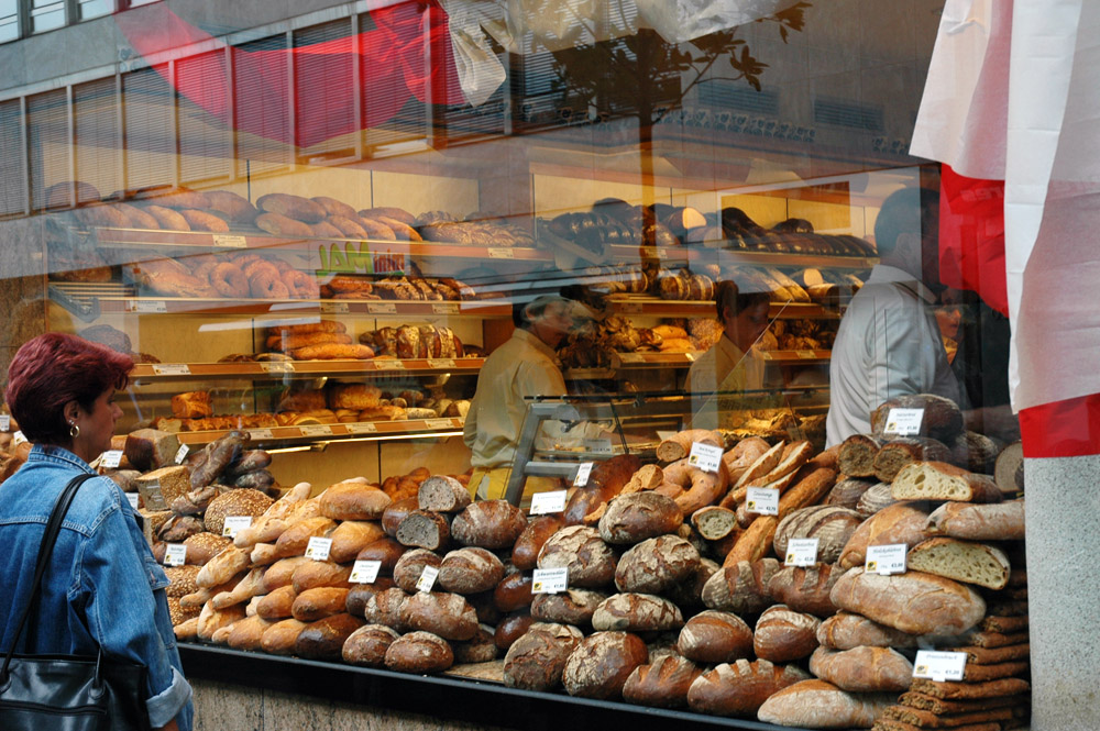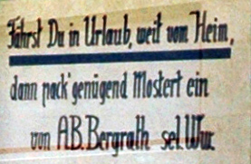 Düsselldorf is famous for mustard, and this sign in the window reads - (freely rhymed and translated): If far from home you tarry Sufficient mustard you must carry |