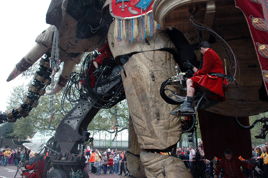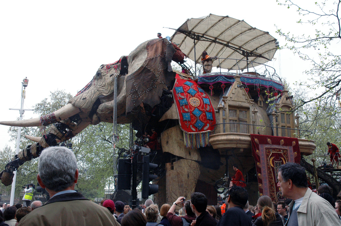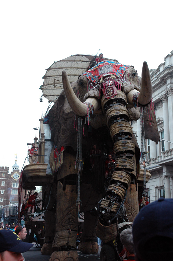 Actually, it's Jules Verne's elephant. This then closes the loop for me with Nantes, France, the home of Jules Verne, the 19th century technical visionary. The stamp was issued in his honor by Monaco. It depicts a mechanical elephant. In Nantes there is now a theme-park, that did not exists when I visited there in 2001, where such mechanical creatures are on display. Luck had it, that the French band Les Balayeurs du désert arrived from Nantes to perform Jules Verne Impact in London in 2006, and I was there to witness the spectacle of the mechanical elephant. |