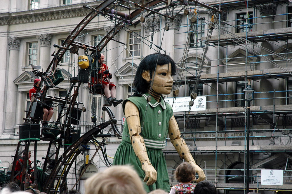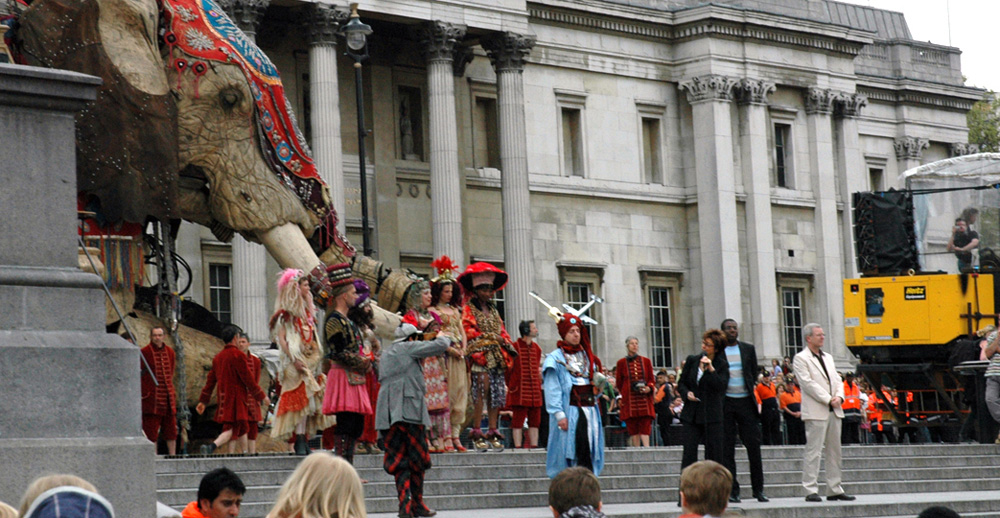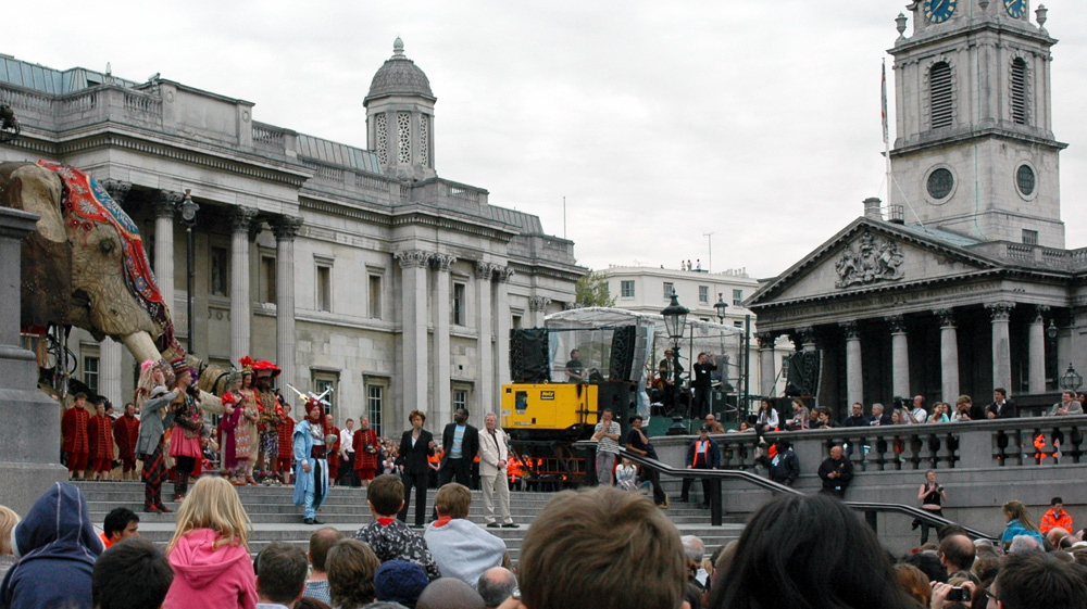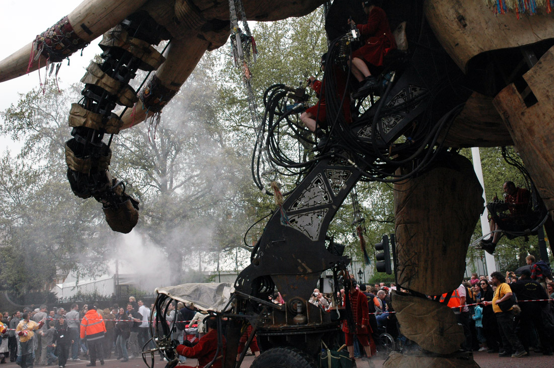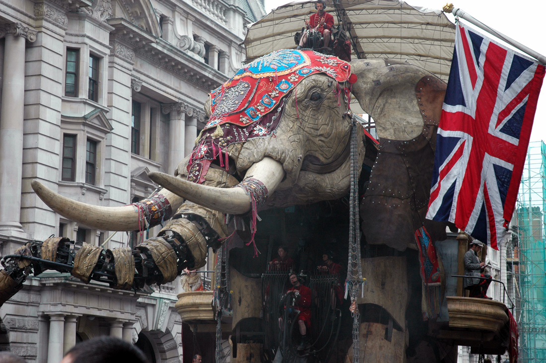 A mechanical elephant slowly walking by, occasionally spraying the massed audience with a fine mist of water |