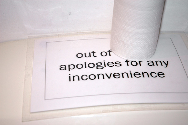 The clean Museum toilet did not run out of paper, btw, the word that I artfully covered up with paper, to take a snapshot of their sign of preemptive apologies. |