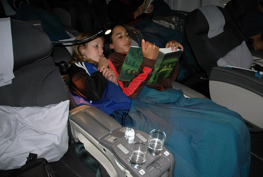 On the way home on United, I upgraded to business class, slept and when I woke up, these two were comfortably resting in the seat next to me, one reading the latest Harry Potter book to the other. |