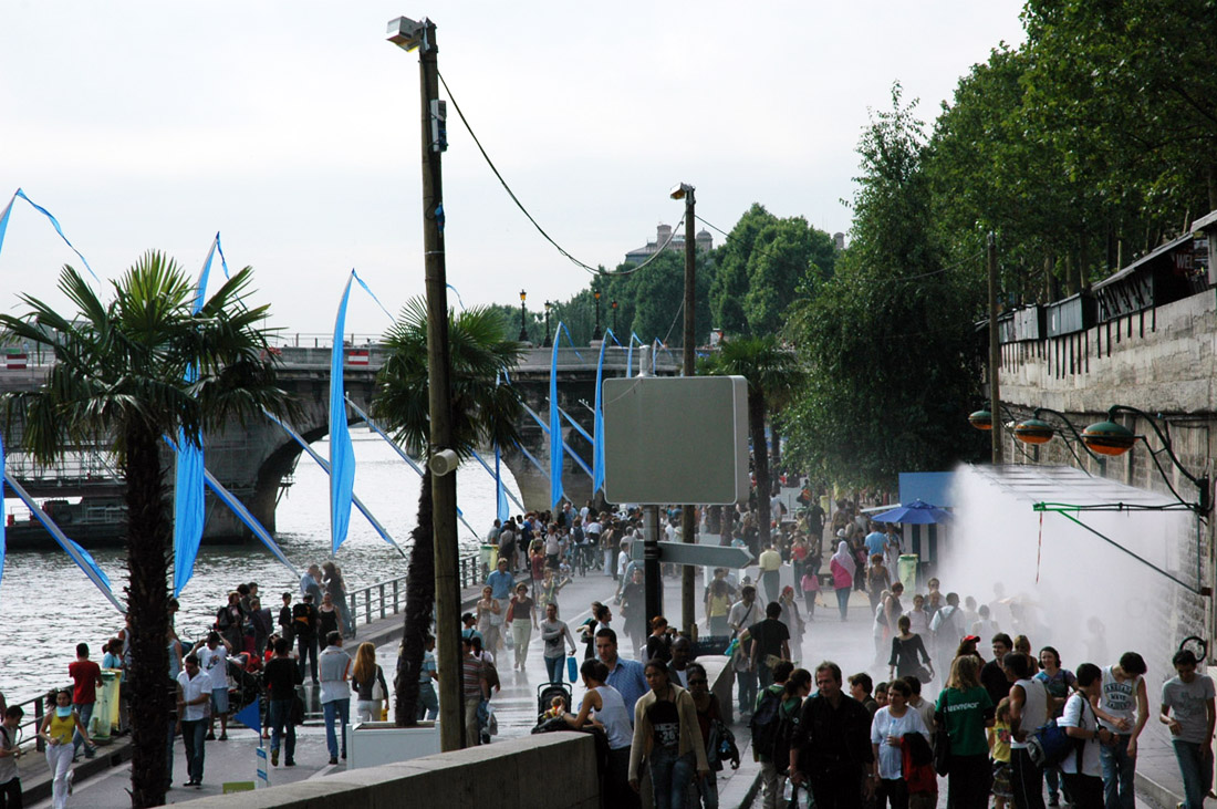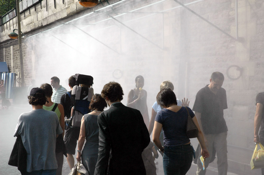 It was a very warm day and people and I (covering the camera) walked through the refreshing mister |