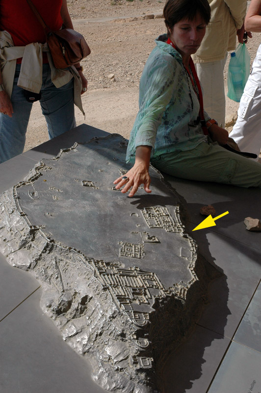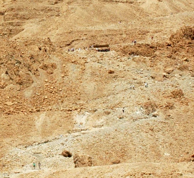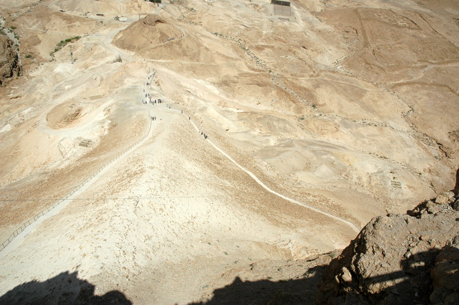In the distance one can see the outline of the typical Roman encampments that were there for more than three years, 2000 years ago. In the foreground you can see the immense ramp the Romans built to reach the top of Masada in force. It was larger than this, because as you know, it terminated right at the wall, where you see all of the people at the top. WInds and weather, in the course of two millennia, reduced it to this. |