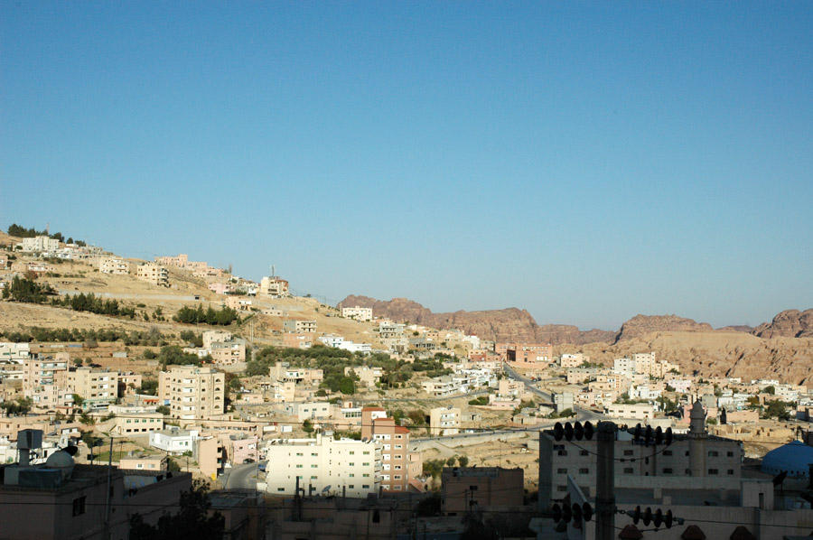 View of Wadi Musa from the guesthouse. Everyday I walked though the town to the distant hills to Petra. I took a car, shared with others, from Aqaba to Wadi Musa, and at one point stopped to take a ...er...break, and the night was incredibly cold. |
