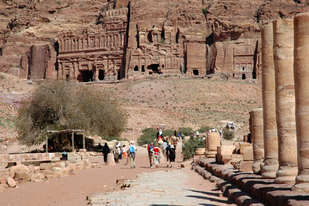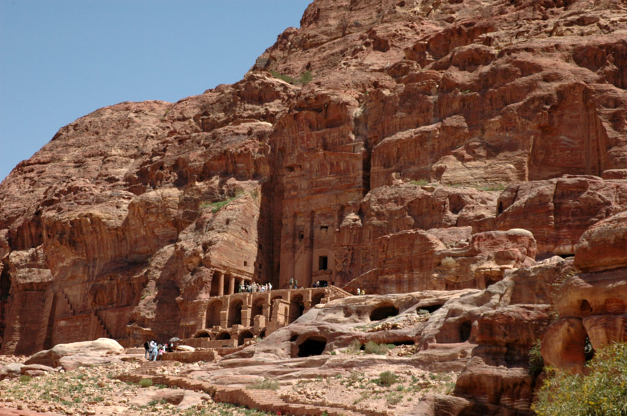 | This amazing scene is almost all you need of Petra and you'd be ok, leaving then and there with a memory to last forever. Having said that, there is a whole valley with great ruins and surrounding mountains to explore, with many paths, hundreds of stone steps to climb, and a counterpoint to this structure at the far end of Petra, up high in the hills, and beyond that a small peak with a flag, the hiker's turn-around point. |