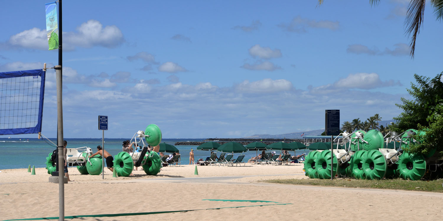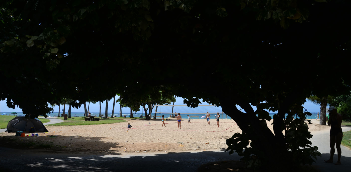 Green rules the beach. Somehow, everything here, even the volleyball court lines in the sand, is green. |