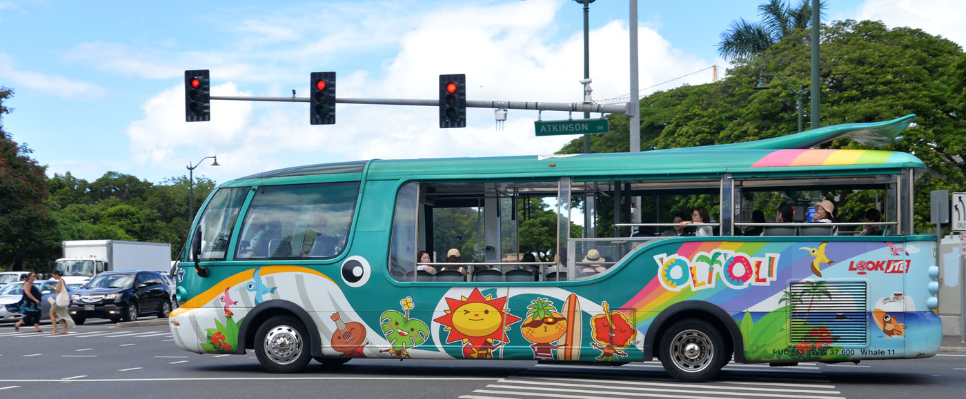 At the corner of the Ala Moana Center, the Olioli 'whale' bus. Japanese tourists seemed to be the main customers. Open sides to accommodate photography |