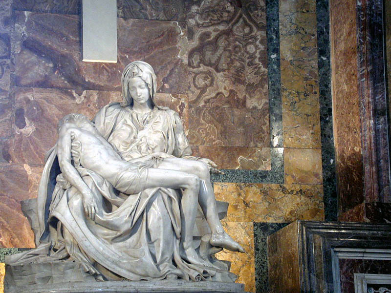 Michelangelo's Pieta on permanent display in St. Peter's Basilica. Completed when Michelangelo was just 24. Because of the hammer attack in 1972, by some crazed Hungarian, who thought he was Jesus Christ, it is now behind bullet-proof glass |
