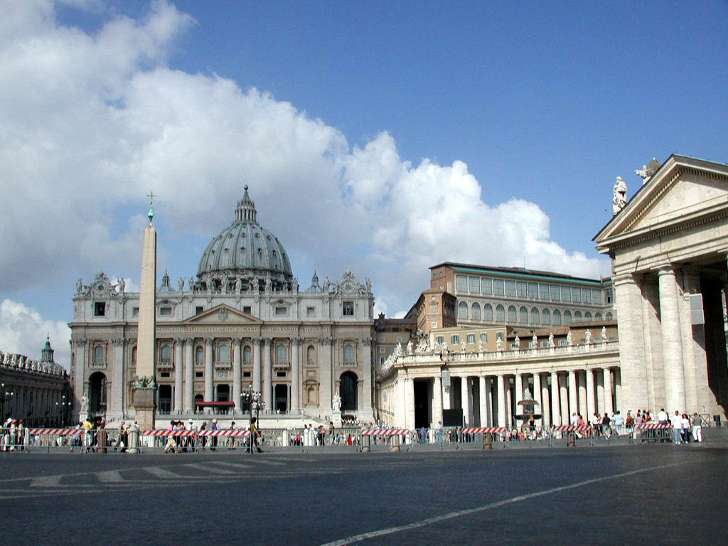 Piazza di San Pietro getting ready for the Wednesday audience and the majestic St Peter's Basilika Note the three windows of the Papal apartment to the right |