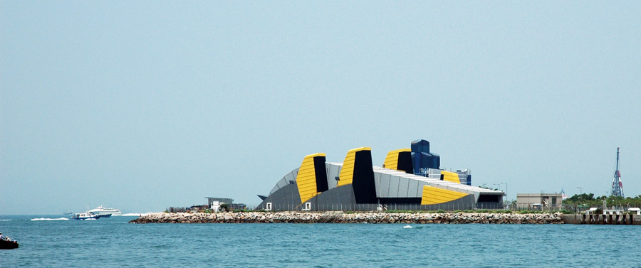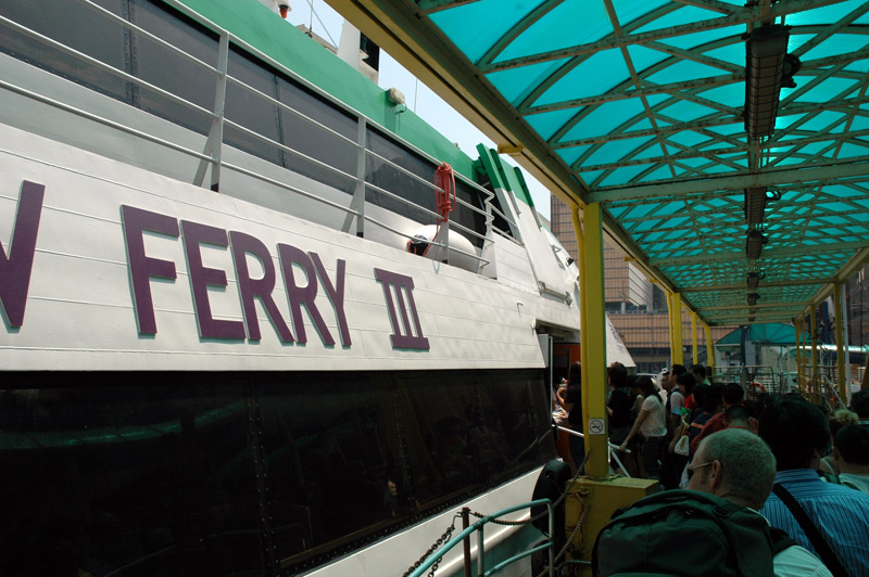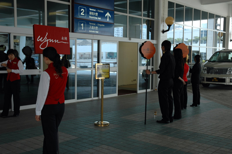 The employees from the hotels and casinos lining up to guide the next ferry-load of visitors and their money to their destinations |