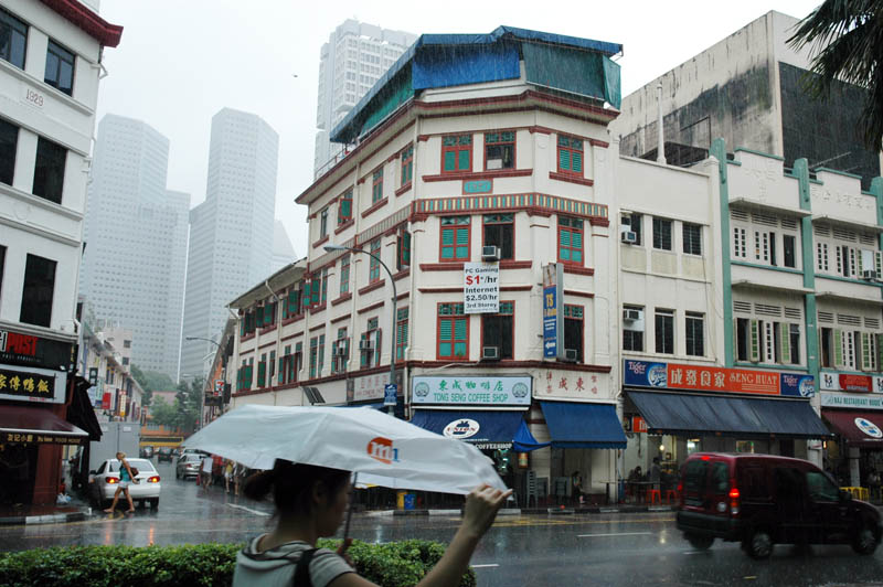 Stepped out of the great Bugis Subway station into pouring rain. Beach Hotel, at the far end of this street. |