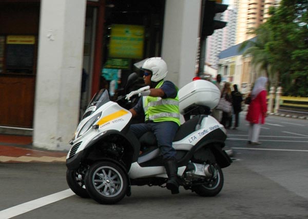 | The Piaggio MP3 Scooter. Popular Mechanics loves it. You can really lean it hard, but it is very stable and just sips the gas. I saw several here in Sacramento not long ago. This one is used by the traffic cops (LTA) in Singapore. Not cheap, however. About $10K US. |