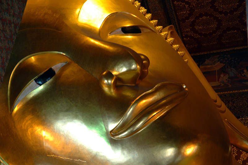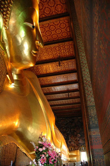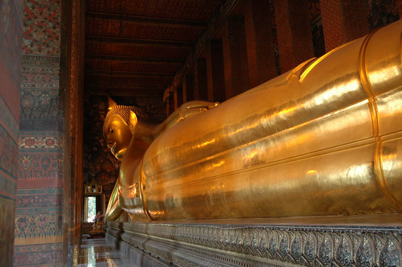 | I find this immense statue of the reclining Buddha at Wat Po, beyond compare. I remembered it for 40 years, since I saw it last, and still find it as fascinating and impressive today as I did back then. The shot at the bottom of the page gives you a sense of scale. Look at the people standing next to his feet. It's absolutely huge - don't miss it. |