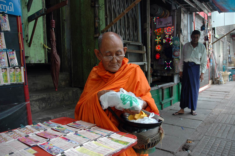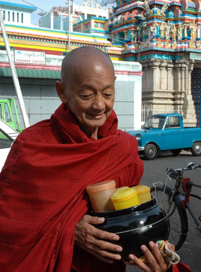 | A Buddhist monk doing his morning collection - in the background a Hindu temple |